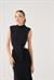 Şıklığın iddialı yorumu: balıkçı yaka vatkalı, fermuar kapamalı kolsuz, bel dekolteli ve eteği büzgü detaylı uzun elbise.