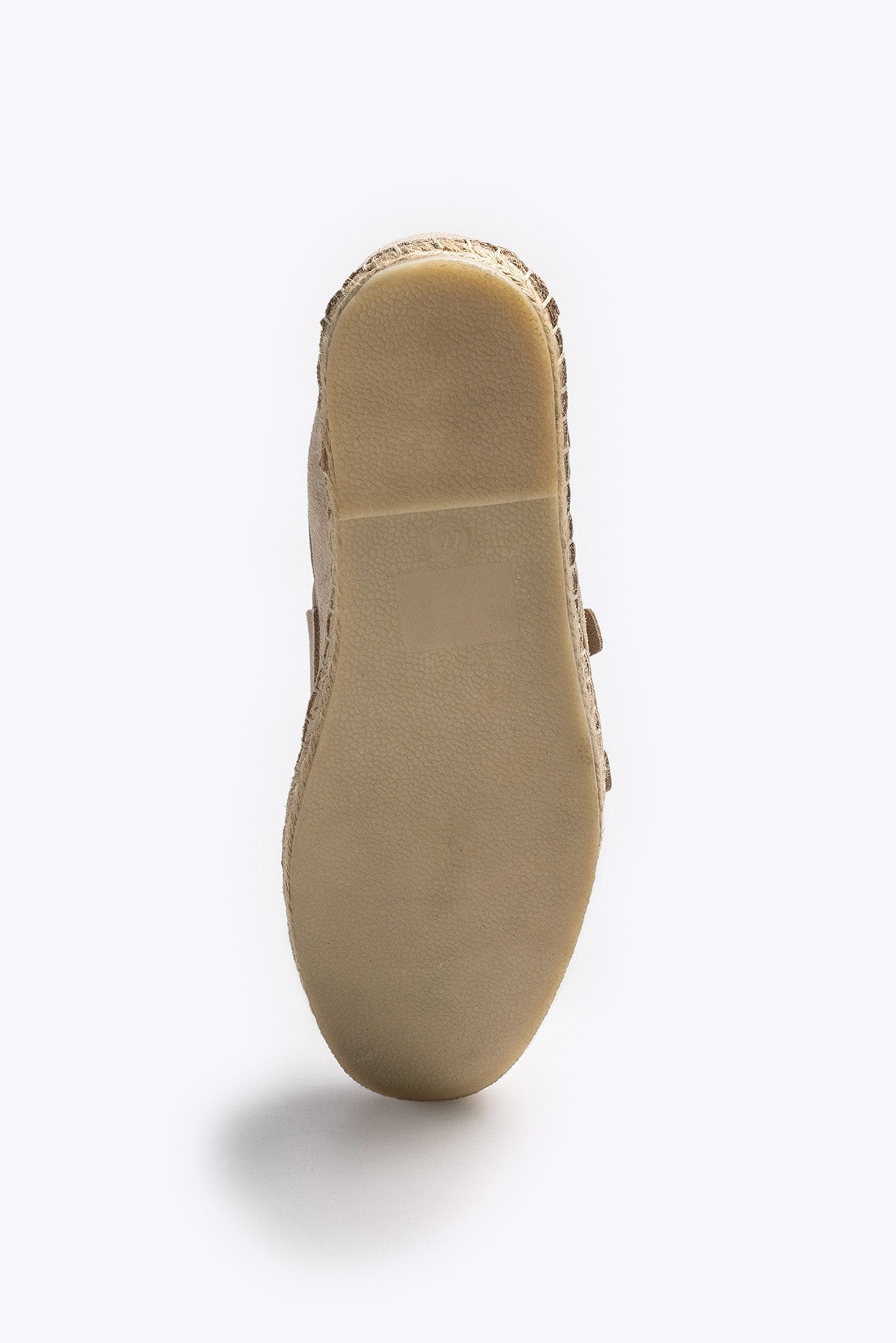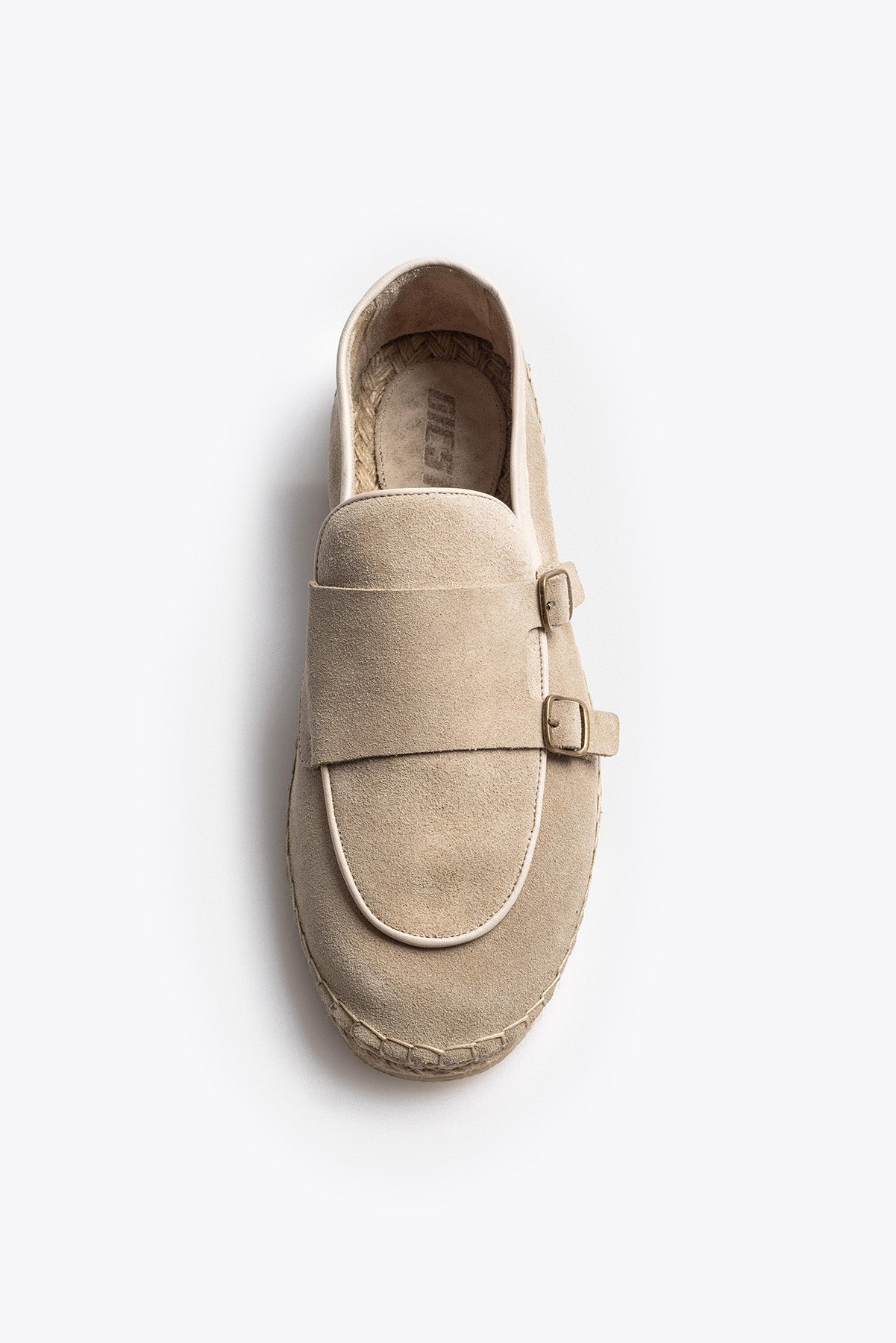 Çift toka detaylı, süet kumaş, jüt kaplama dikiş detaylı klasik ayakkabı.