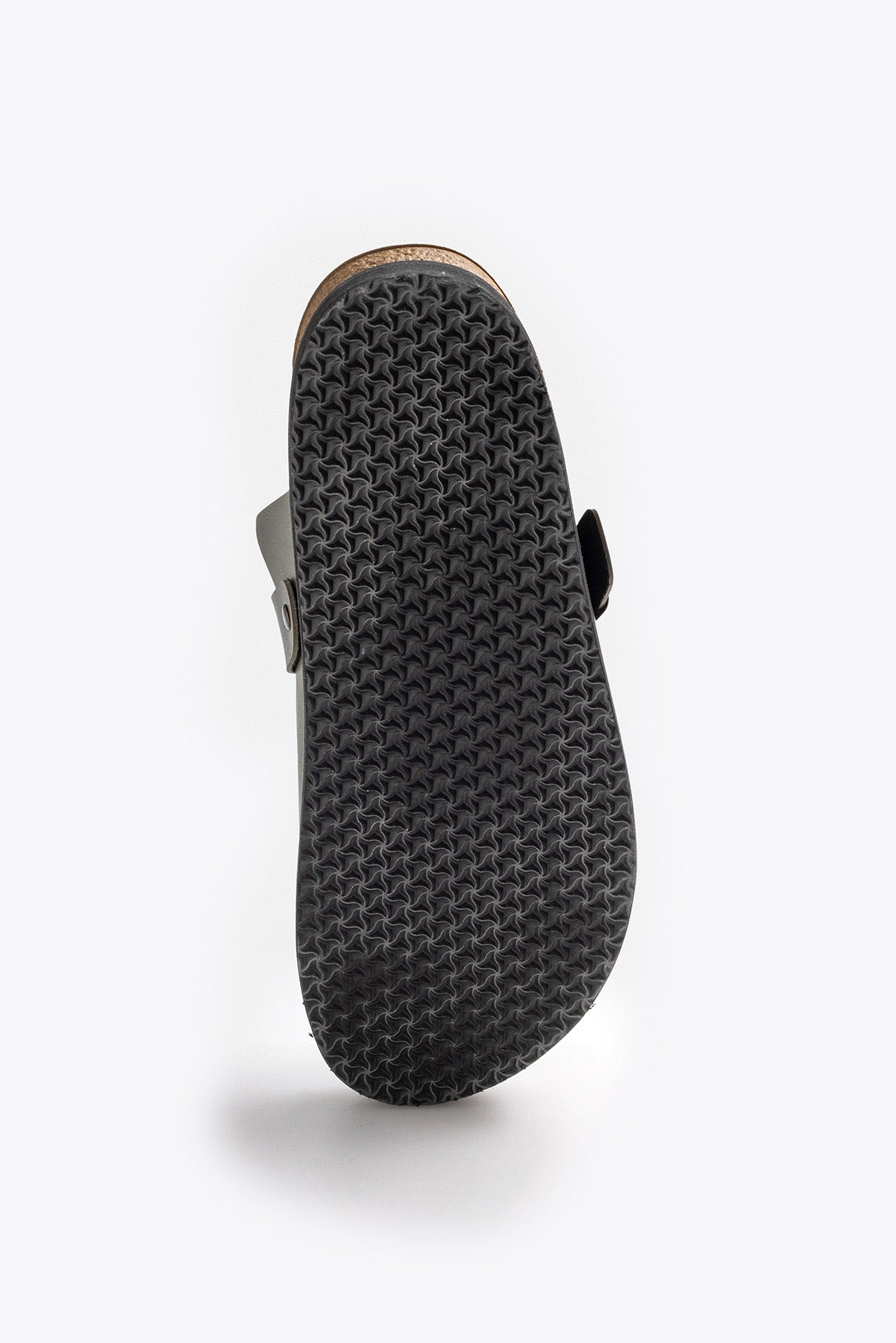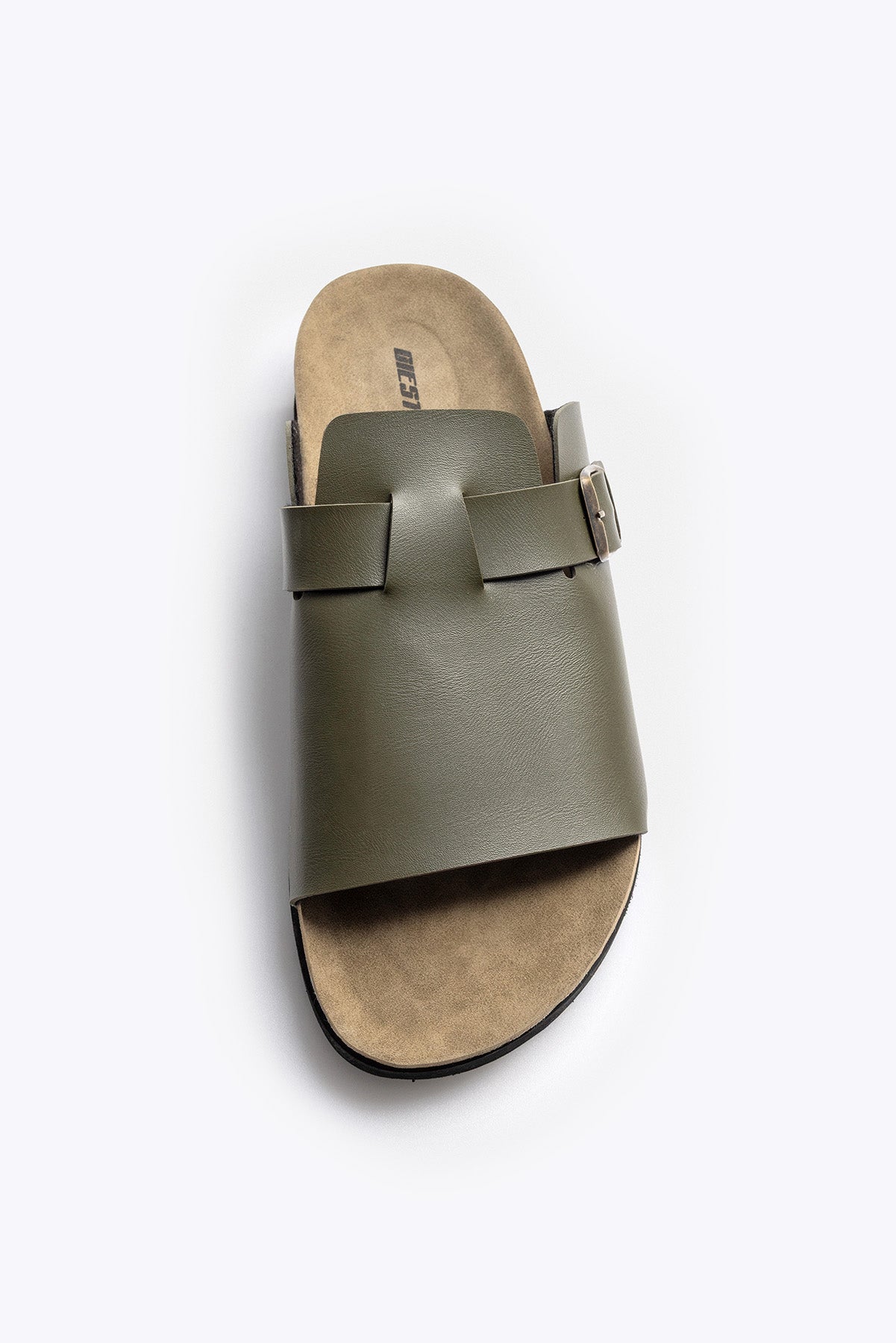 Toka detaylı, geniş bantlı, kalın tabanlı terlik.