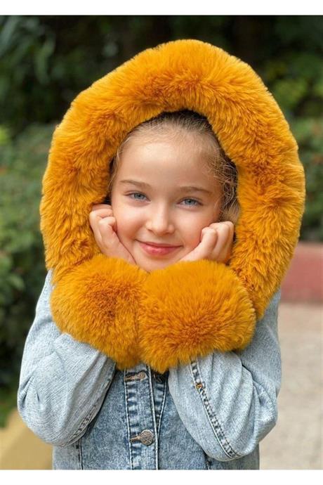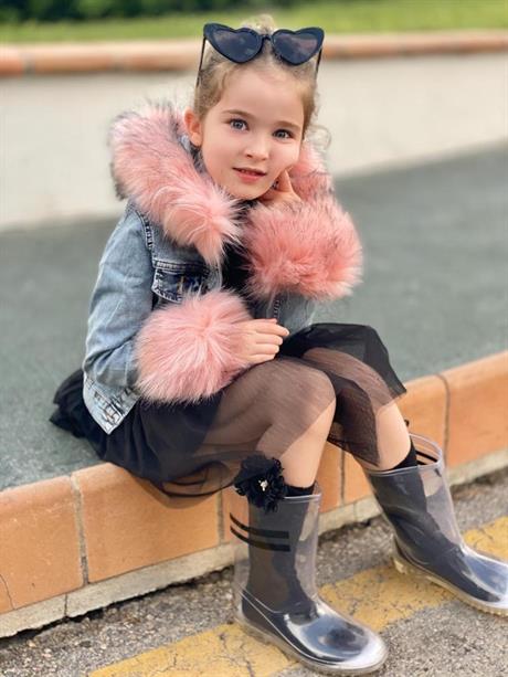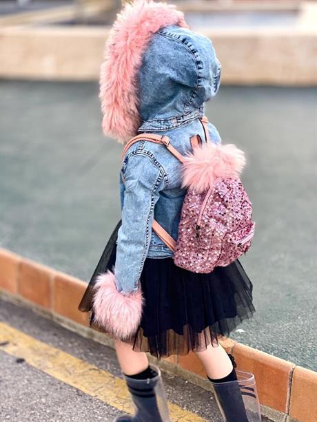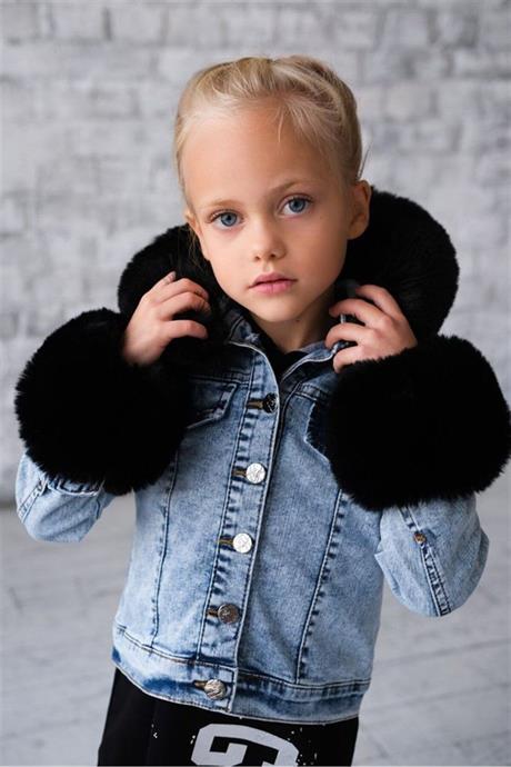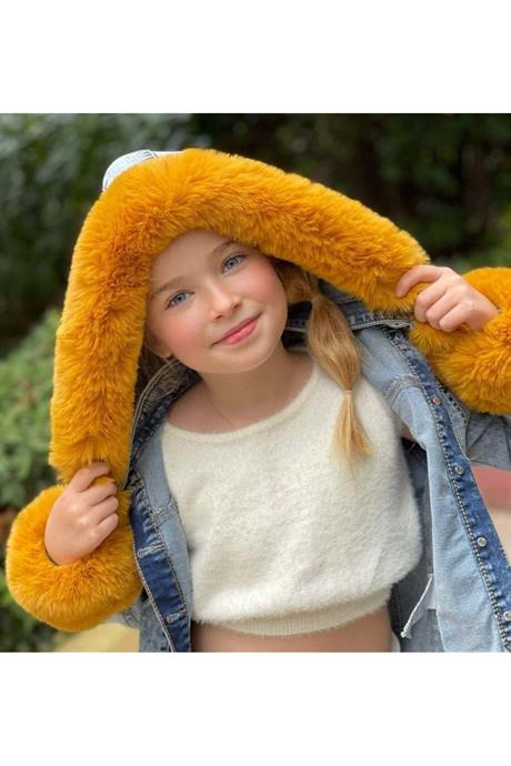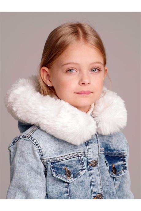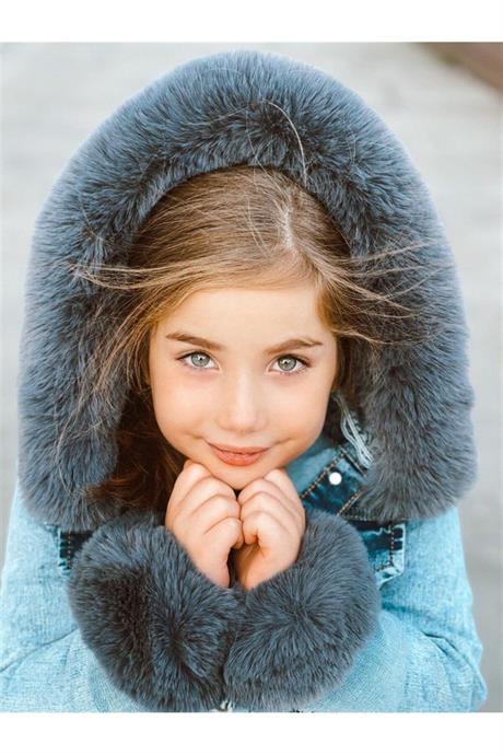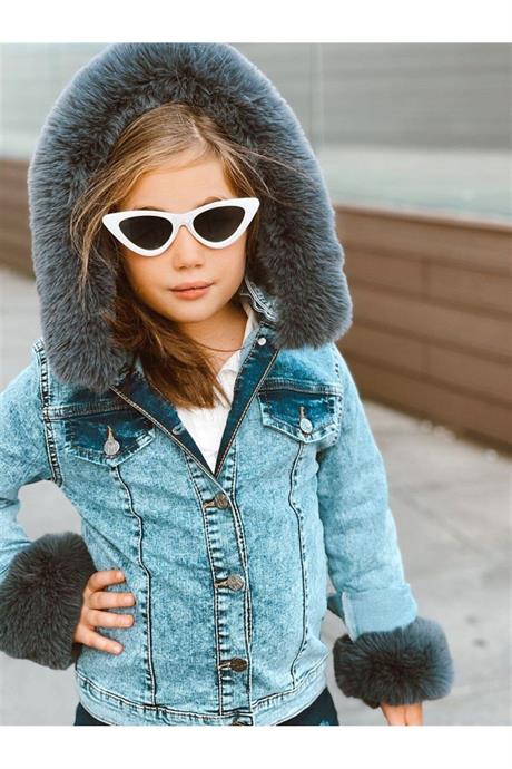 Kız Çocuk Kolları Kürk Detaylı Kapüşonlu Mavi Kot Ceket